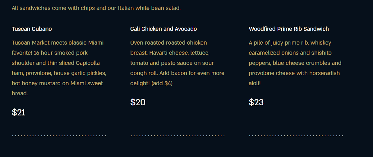 Start your culinary journey with exquisite appetizers like Burrata and Honeycomb or a delightful Market Cheese Board featuring artisanal selections. For sandwiches, savor the creatively crafted Tuscan Cubano—a bold combo of smoked pork and pickles on sweet bread—or the savory Cali Chicken and Avocado for a fresh twist.